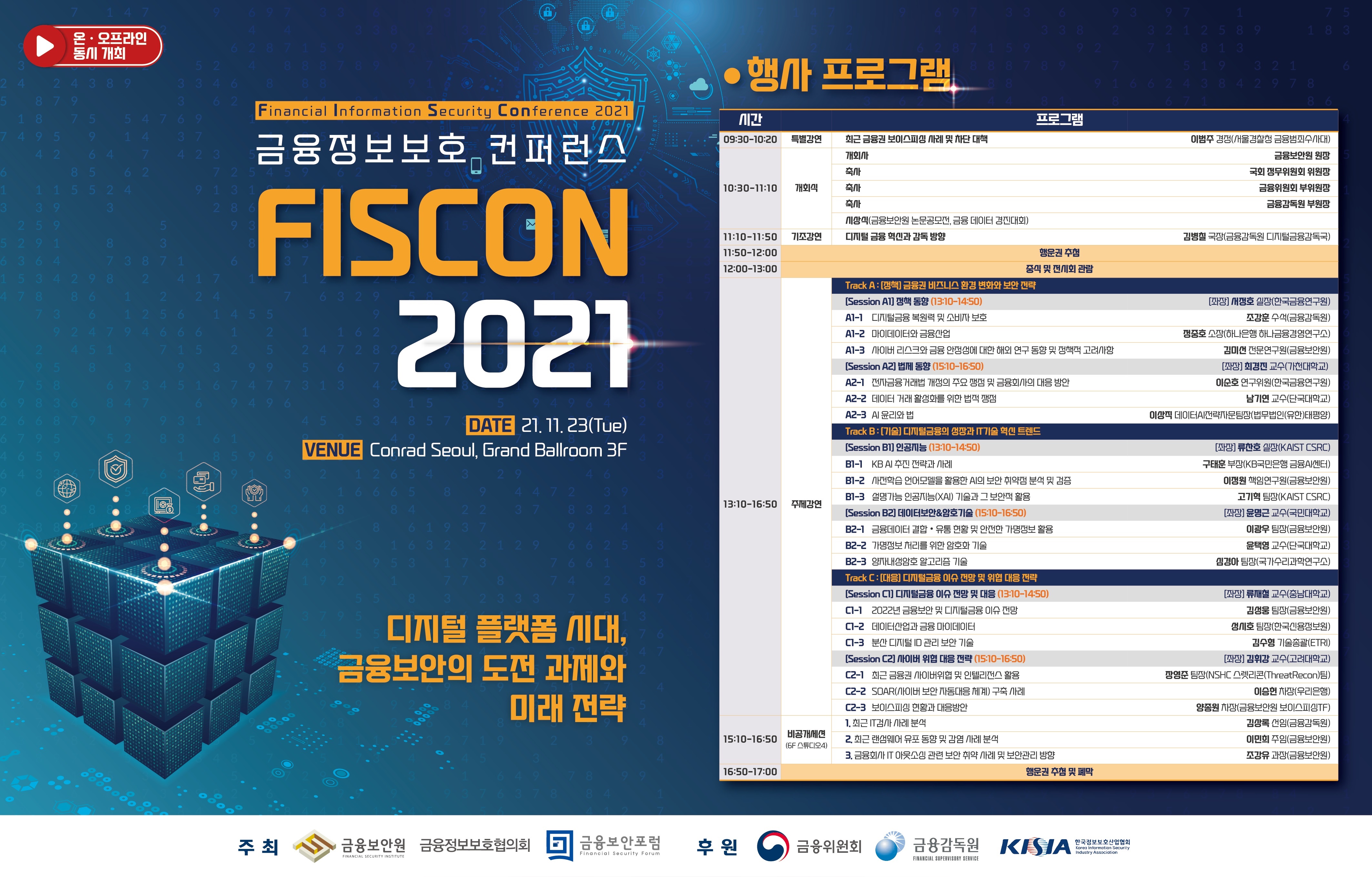 「FISCON 2021」은 "디지털 플랫폼 시대, 금융보안원 도전 과제와 미래 전략"이라는 주제로 디지털 플랫폼 시대에 금융 비즈니스의 보안 도전 과제에 대한 해결책을 함께 고민하고 금융보안 전략을 모색해 볼 수 있는 기회의 장을 제공합니다.