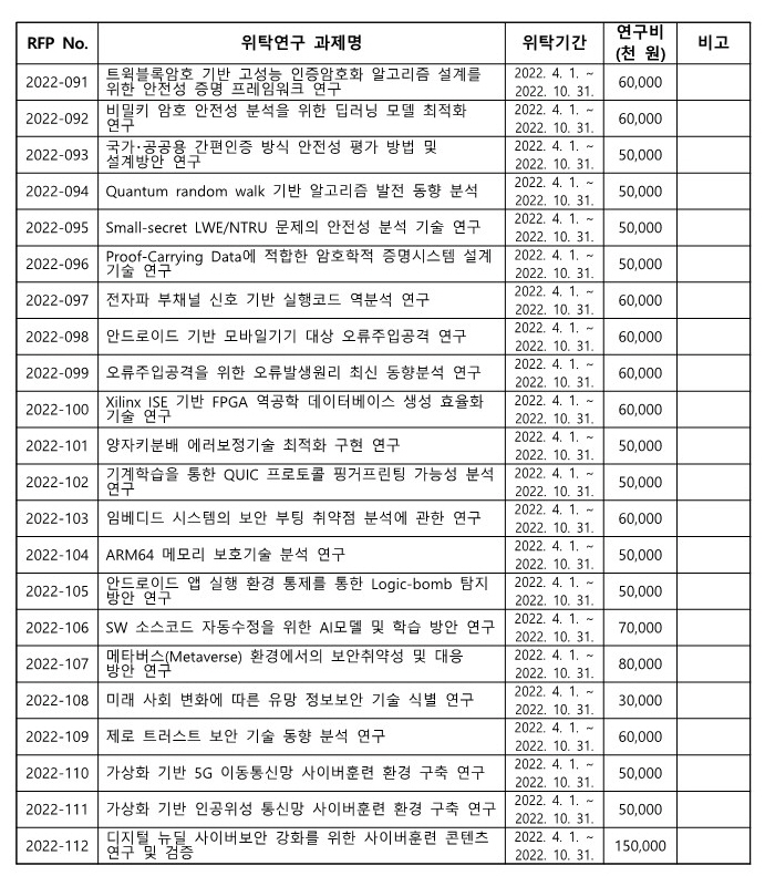 [국가보안기술연구소] 제2022-1차 국내위탁연구 수행기관 선정 공모 안내
