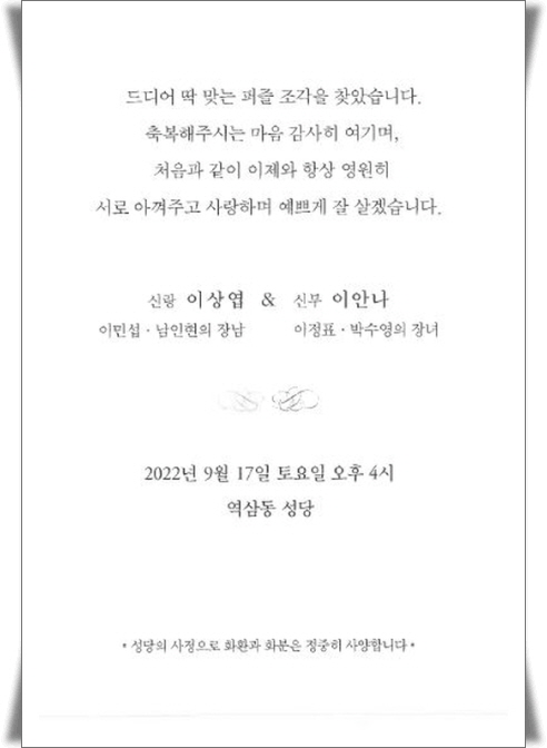 학회 명예회장님이신 단국대학교 이민섭 교수님 子婚(이상엽) 소식을 알려드립니다.