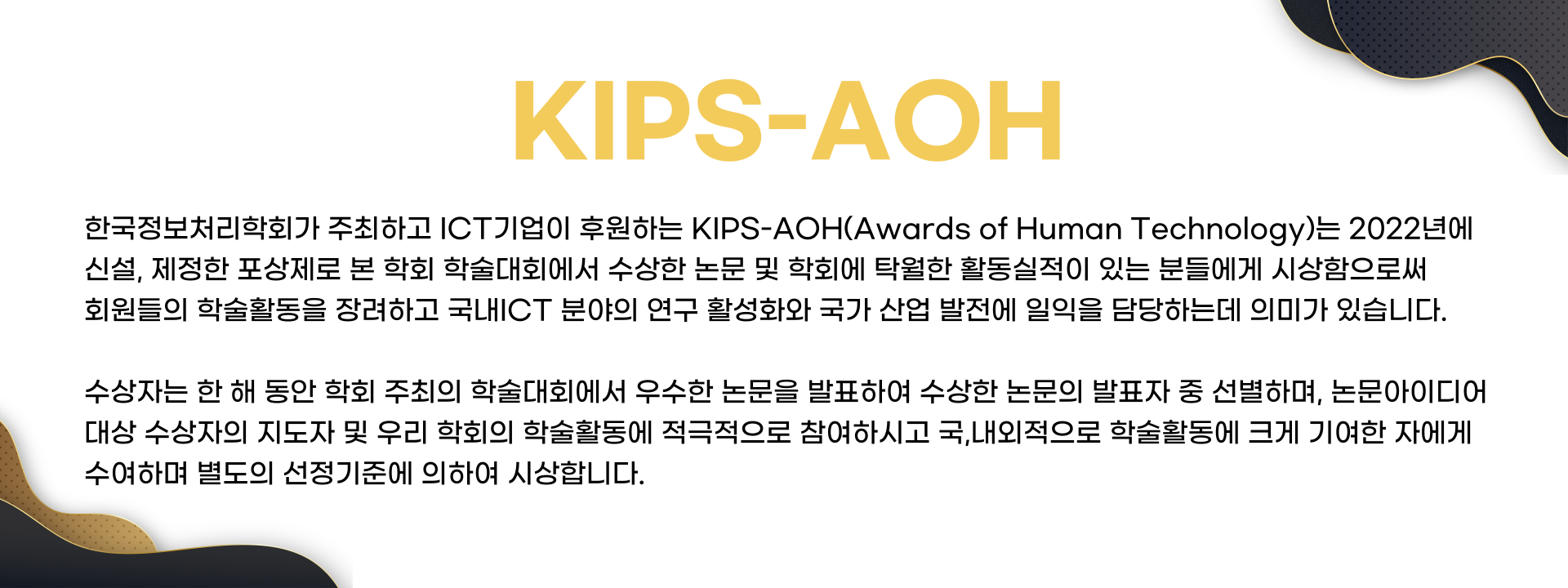 한국정보처리학회가 주최하고 ICT기업이 후원하는 KIPS-AOH(Award of Human Technology)를 2022년 신설하여 본 학회 학술대회에서 수상한 논문을 대상으로