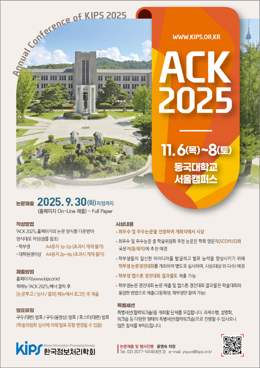 ACK 2025에서 수상한 논문은 학회 영문지(JIPS-SCOPUS) 및 국문지(TKIPS-등재학술지)에 추천할 예정이오니, 많은 논문 제출을 부탁드립니다.