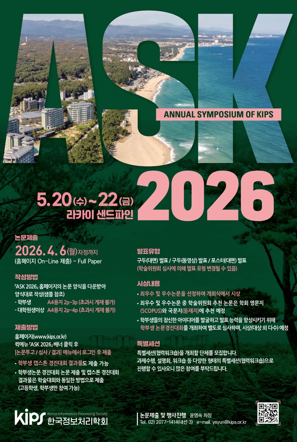 ASK 2026에서 수상한 논문은 학회 영문지(JIPS-SCOPUS) 및 국문지(TKIPS-등재학술지)에 추천할 예정이오니, 많은 논문 제출을 부탁드립니다.